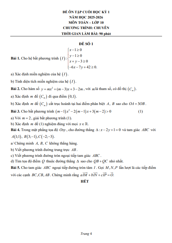 Đề Thi HK1 Toán 10 Đề cuối học kỳ 1 Toán 10 năm 2025 – 2026 trường THPT chuyên Thái Nguyên
