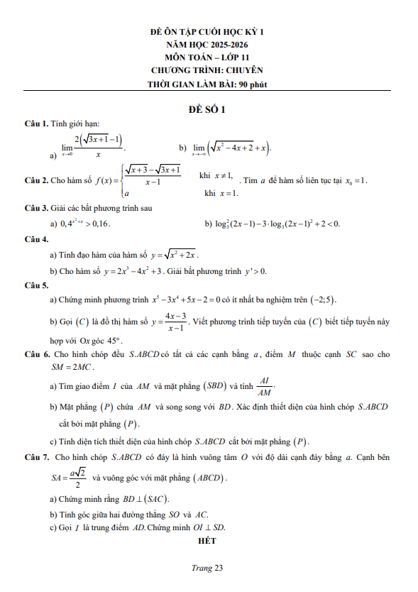 Đề ôn tập CK1 Toán 11 năm 2025 – 2026 trường chuyên Lương Văn Chánh – Đắk Lắk 26/12/2025