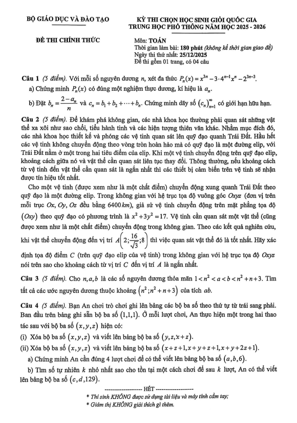 Đề thi chọn học sinh giỏi Quốc gia môn Toán THPT năm học 2025 – 2026 26/12/2025