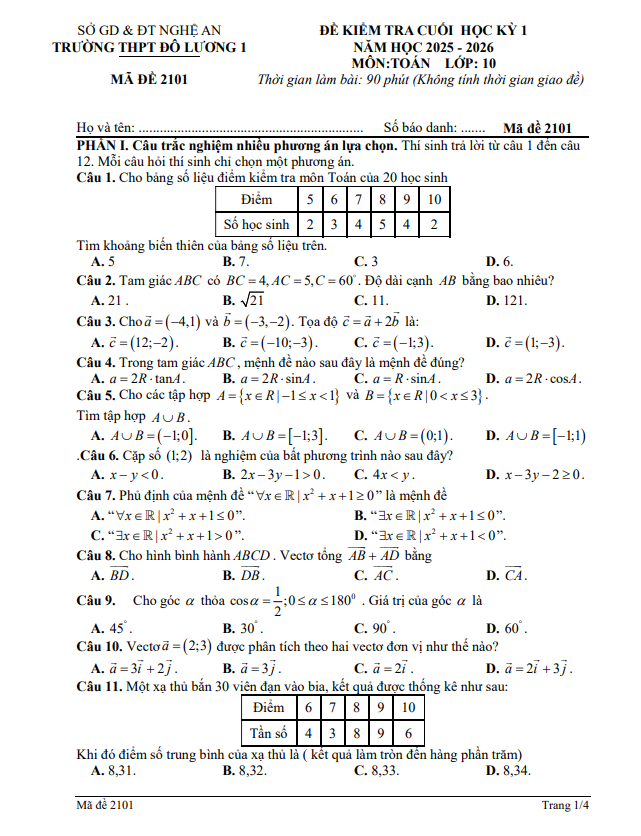 Đề Thi HK1 Toán 10 Đề cuối học kỳ 1 Toán 10 năm 2025 – 2026 trường THPT Đô Lương 1 – Nghệ An