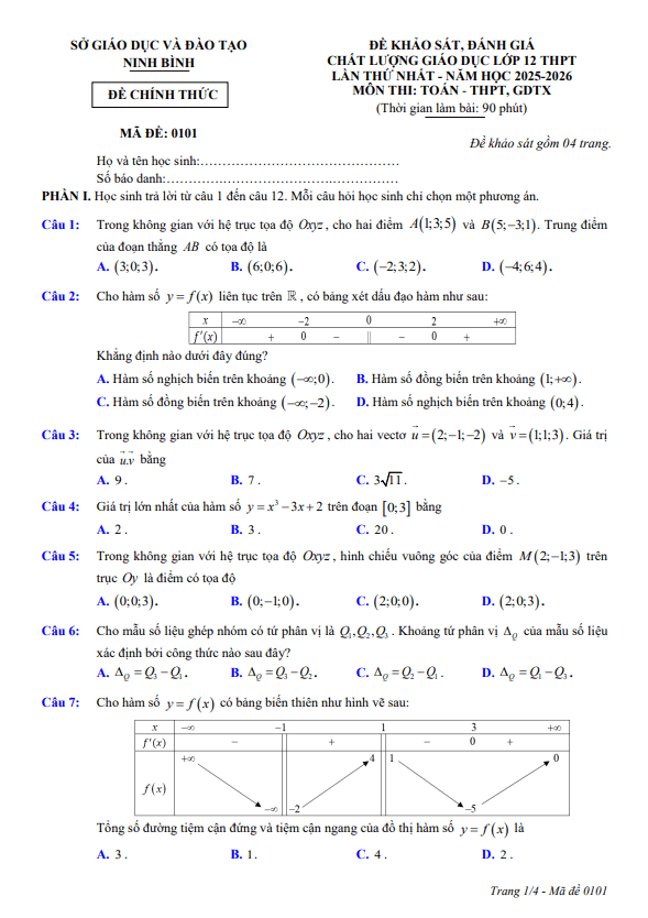 Đề khảo sát Toán 12 lần 1 năm 2025 – 2026 sở GD&ĐT Ninh Bình 30/12/2025