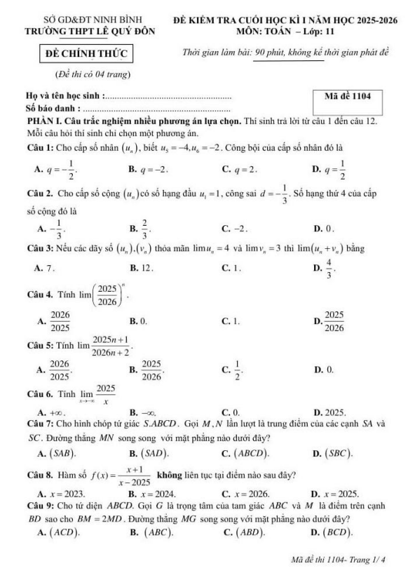 Đề cuối học kì 1 Toán 11 năm 2025 – 2026 trường THPT Lê Quý Đôn – Ninh Bình 02/01/2026