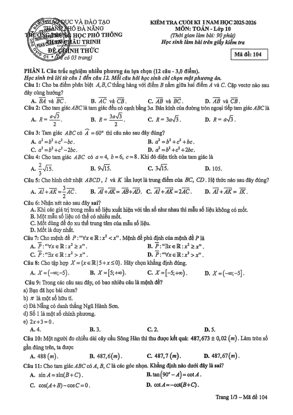Đề Thi HK1 Toán 10 Đề cuối kì 1 Toán 10 năm 2025 – 2026 trường THPT Phan Châu Trinh – Đà Nẵng