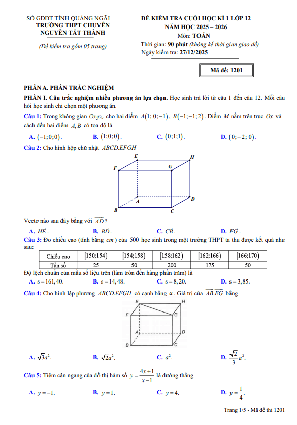Đề cuối kì 1 Toán 12 năm 2025 – 2026 trường chuyên Nguyễn Tất Thành – Quảng Ngãi 02/01/2026