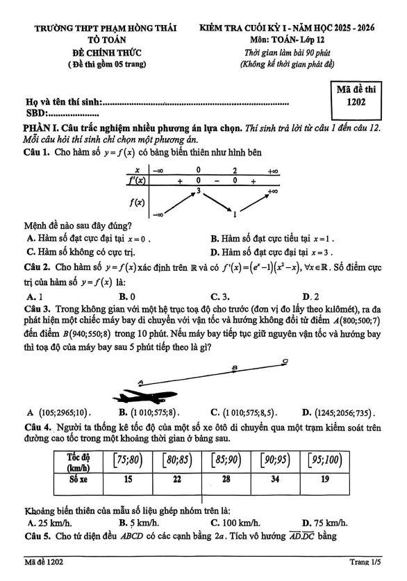Đề cuối kỳ 1 Toán 12 năm 2025 – 2026 trường THPT Phạm Hồng Thái – Hà Nội 02/01/2026