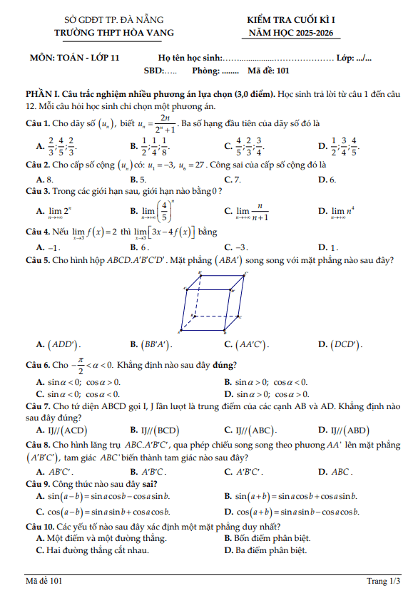 Đề Thi HK1 Toán 11 Đề cuối kì 1 Toán 11 năm 2025 – 2026 trường THPT Hòa Vang – Đà Nẵng