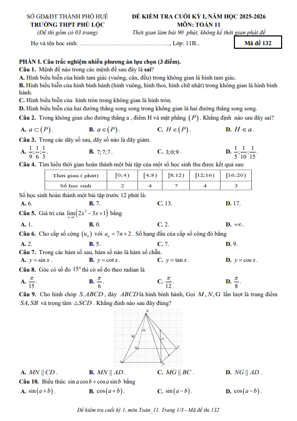 Đề Thi HK1 Toán 11 Đề cuối kỳ 1 Toán 11 năm 2025 – 2026 trường THPT Phú Lộc – Huế