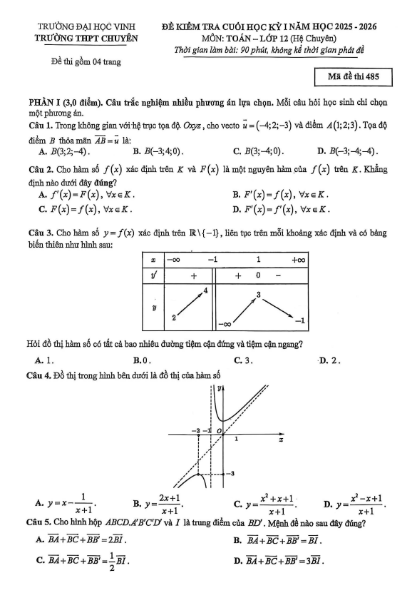 Đề cuối học kỳ 1 Toán 12 năm 2025 – 2026 trường chuyên ĐH Vinh – Nghệ An 31/12/2025