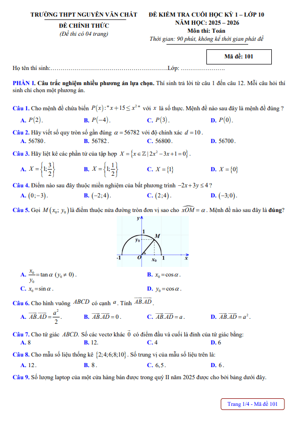 Đề cuối kỳ 1 Toán 10 năm 2025 – 2026 trường THPT Nguyễn Văn Chất – Phú Thọ 31/12/2025