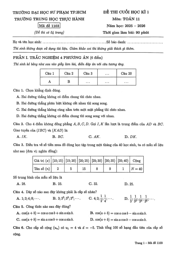 Đề cuối học kì 1 Toán 11 năm 2025 – 2026 trường Trung học Thực hành ĐHSP – TP HCM 25/12/2025
