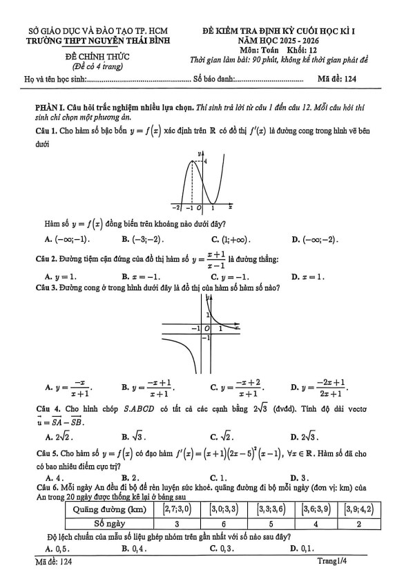 Đề Thi HK1 Toán 12 Đề cuối học kì 1 Toán 12 năm 2025 – 2026 trường THPT Nguyễn Thái Bình – TP HCM
