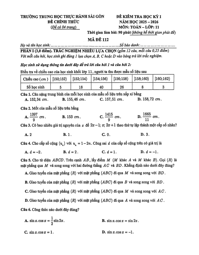Đề học kỳ 1 Toán 11 năm 2025 – 2026 trường TH Thực hành Sài Gòn – TP HCM 25/12/2025
