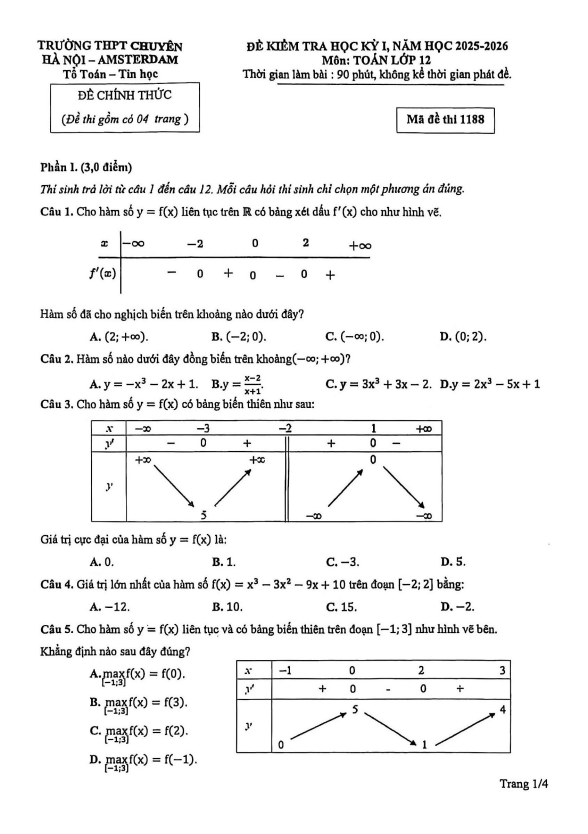 Đề Thi HK1 Toán 12 Đề học kỳ 1 Toán 12 năm 2025 – 2026 trường THPT chuyên Hà Nội – Amsterdam