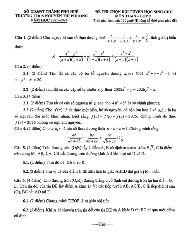 Đề chọn đội tuyển HSG Toán 9 năm 2025 – 2026 trường THCS Nguyễn Tri Phương – Huế 23/02/2026