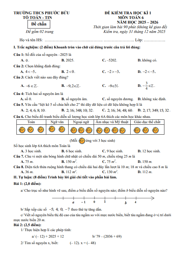 Đề Thi HK1 Toán 6 Đề học kì 1 Toán 6 năm 2025 – 2026 trường THCS Phước Bửu – TP HCM