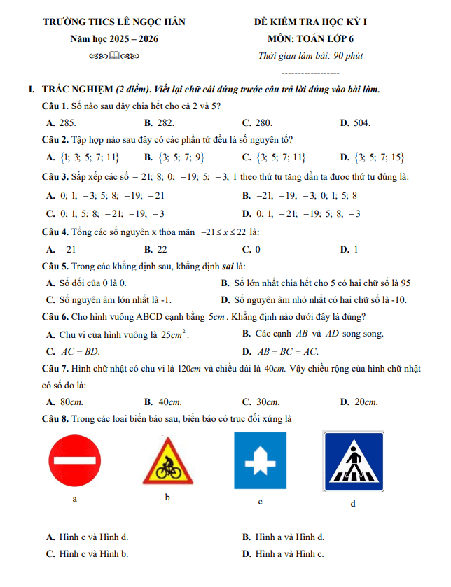 Đề Thi HK1 Toán 6 Đề học kỳ 1 Toán 6 năm 2025 – 2026 trường THCS Lê Ngọc Hân – Hà Nội