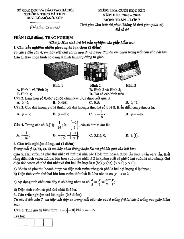 Đề Thi HK1 Toán 7 Đề cuối học kì 1 Toán 7 năm 2025 – 2026 trường M.V. Lômônôxốp – Hà Nội