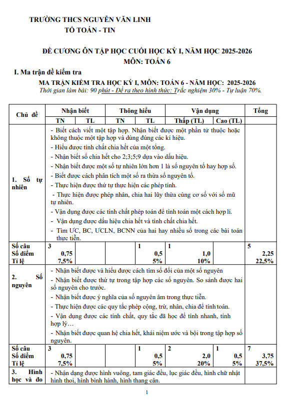 Đề cương cuối kì 1 Toán 6 năm 2025 – 2026 trường THCS Nguyễn Văn Linh – TP HCM 15/12/2025