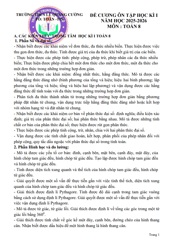 Đề cương học kì 1 Toán 8 năm 2025 – 2026 trường THCS Lê Quang Cường – TP HCM 15/12/2025
