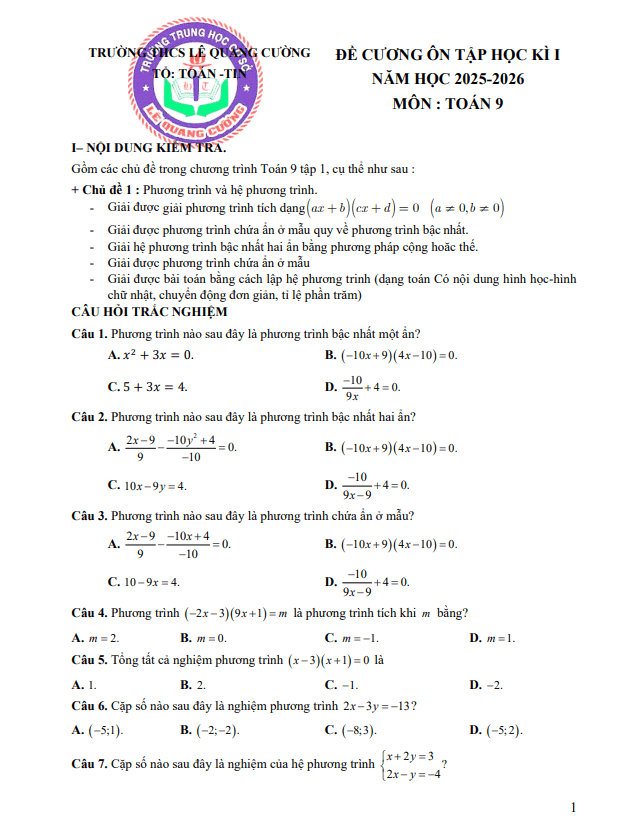 Đề cương học kì 1 Toán 9 năm 2025 – 2026 trường THCS Lê Quang Cường – TP HCM 15/12/2025