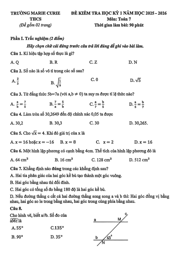 Đề Thi HK1 Toán 7 Đề học kỳ 1 Toán 7 năm 2025 – 2026 trường Marie Curie – Hà Nội