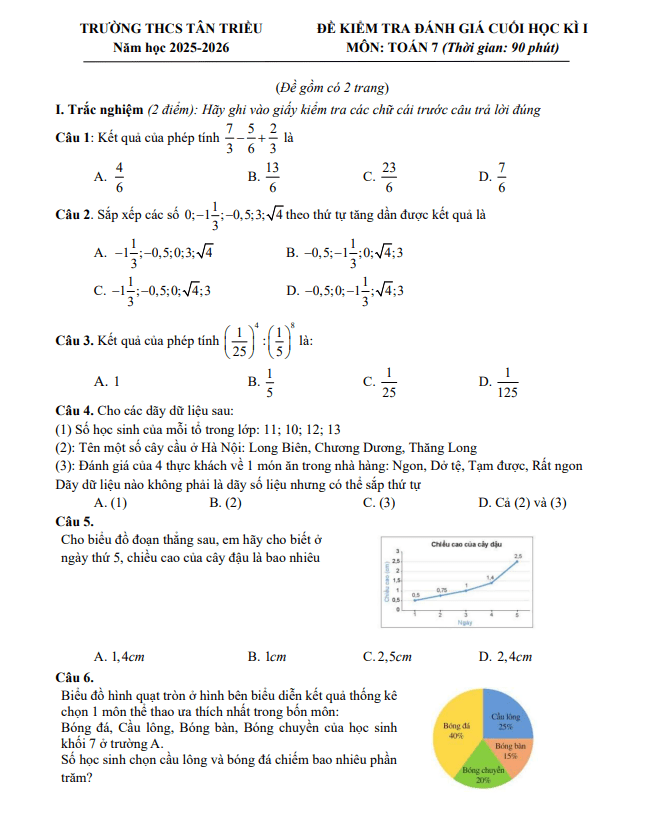 Đề Thi HK1 Toán 7 Đề cuối học kỳ 1 Toán 7 năm 2025 – 2026 trường THCS Tân Triều – Hà Nội
