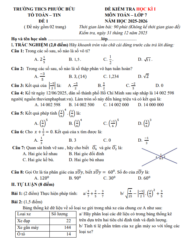 Đề Thi HK1 Toán 7 Đề học kì 1 Toán 7 năm 2025 – 2026 trường THCS Phước Bửu – TP HCM