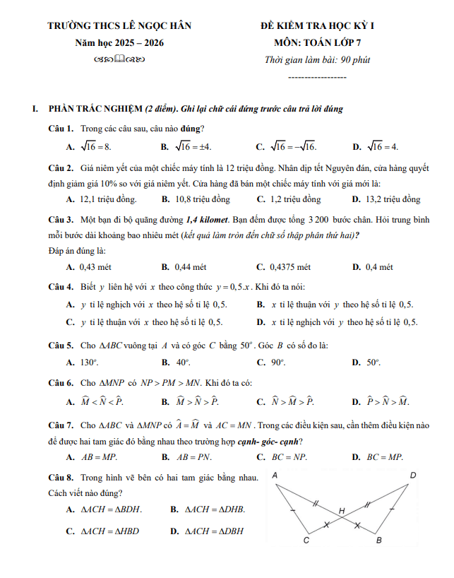 Đề Thi HK1 Toán 7 Đề học kỳ 1 Toán 7 năm 2025 – 2026 trường THCS Lê Ngọc Hân – Hà Nội