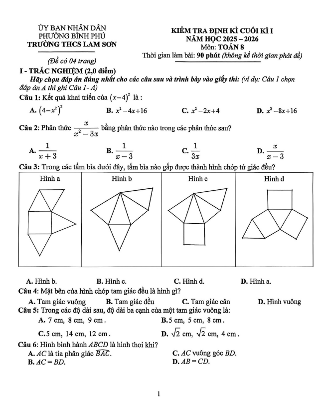 Đề Thi HK1 Toán 8 Đề cuối kì 1 Toán 8 năm 2025 – 2026 trường THCS Lam Sơn – TP HCM