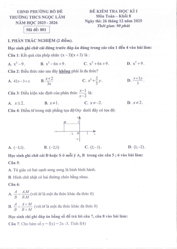 Đề Thi HK1 Toán 8 Đề học kì 1 Toán 8 năm 2025 – 2026 trường THCS Ngọc Lâm – Hà Nội