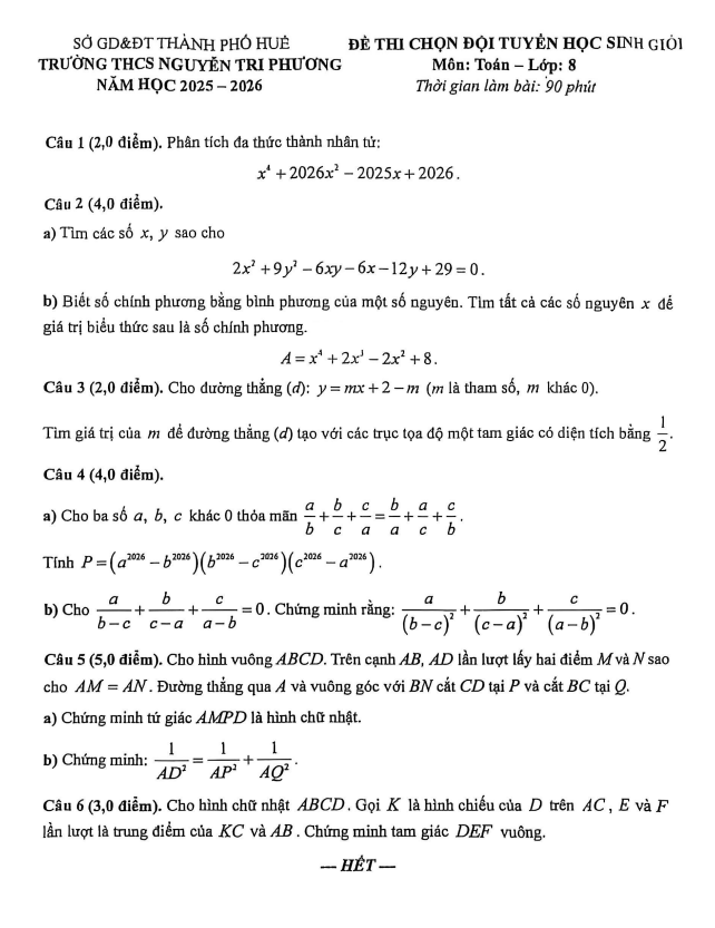 Đề chọn đội tuyển HSG Toán 8 năm 2025 – 2026 trường THCS Nguyễn Tri Phương – Huế 07/03/2026