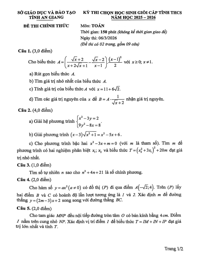 Đề chọn học sinh giỏi tỉnh Toán THCS năm 2025 – 2026 sở GD&ĐT An Giang 07/03/2026