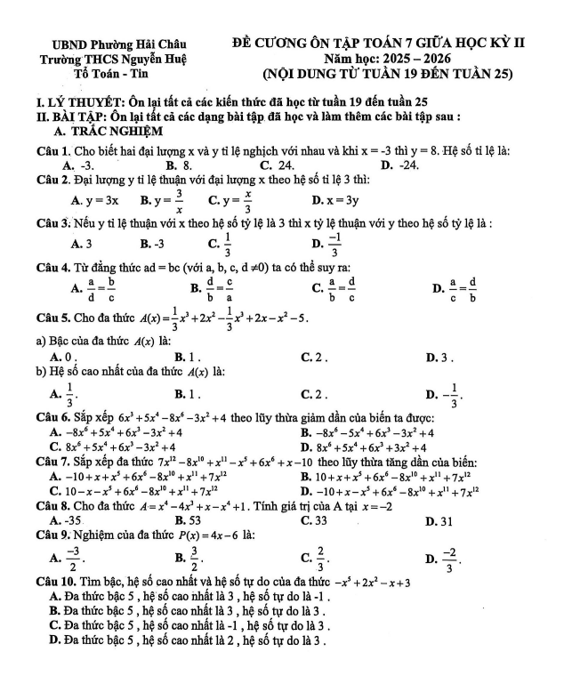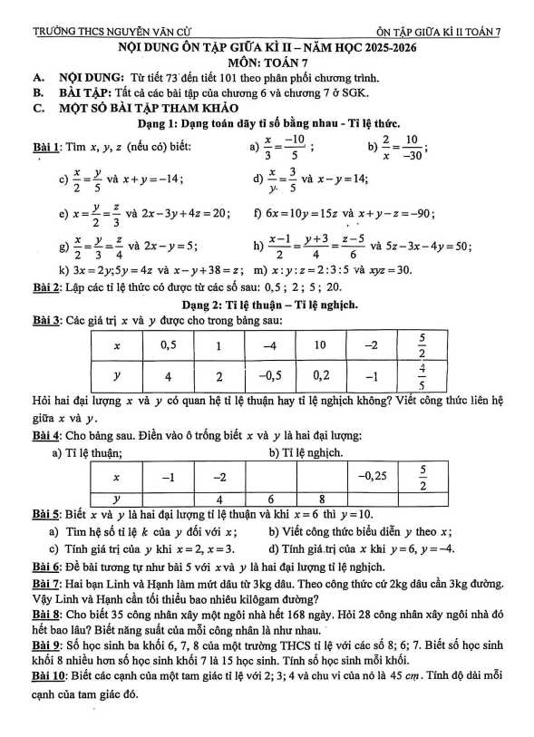 Ôn tập giữa kì 2 Toán 7 năm 2025 – 2026 trường THCS Nguyễn Văn Cừ – Đà Nẵng 06/03/2026