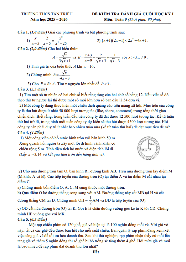 Đề Thi HK1 Toán 9 Đề cuối học kỳ 1 Toán 9 năm 2025 – 2026 trường THCS Tân Triều – Hà Nội