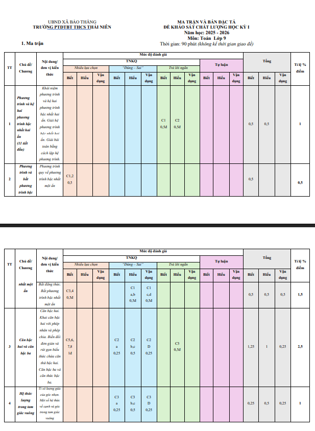 Đề Thi HK1 Toán 9 Đề cuối học kỳ 1 Toán 9 năm 2025 – 2026 trường THCS Thái Niên – Lào Cai