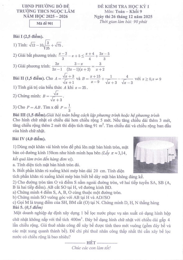 Đề Thi HK1 Toán 9 Đề học kì 1 Toán 9 năm 2025 – 2026 trường THCS Ngọc Lâm – Hà Nội