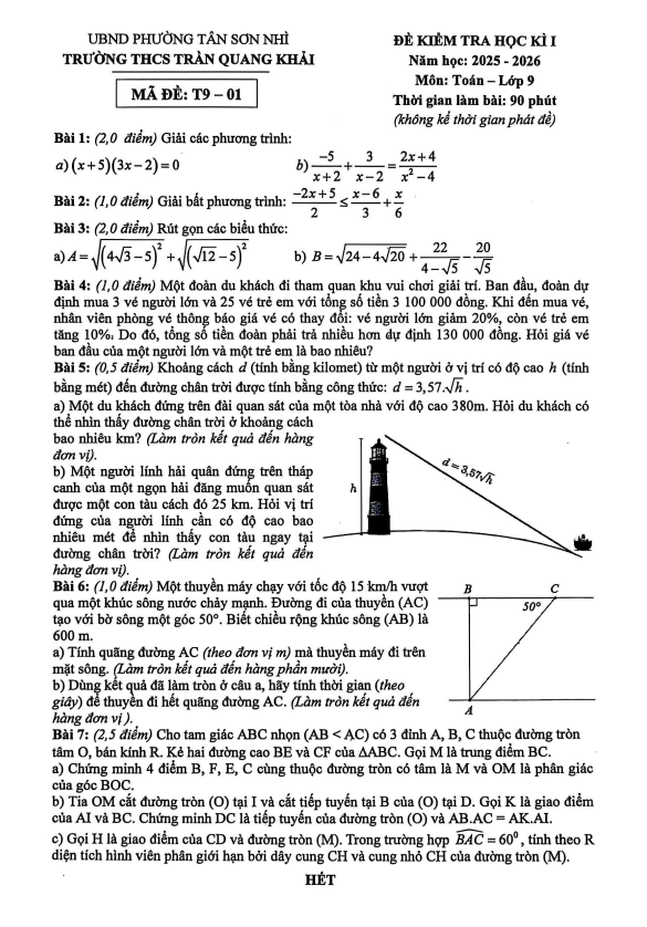 Đề Thi HK1 Toán 9 Đề học kì 1 Toán 9 năm 2025 – 2026 trường THCS Trần Quang Khải – TP HCM