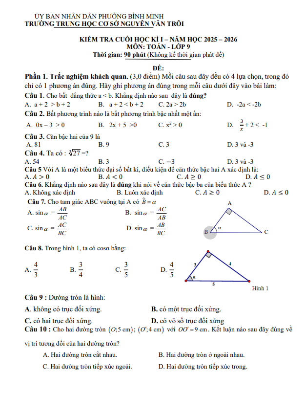 Đề Thi HK1 Toán 9 Đề cuối kì 1 Toán 9 năm 2025 – 2026 trường THCS Nguyễn Văn Trỗi – Tây Ninh