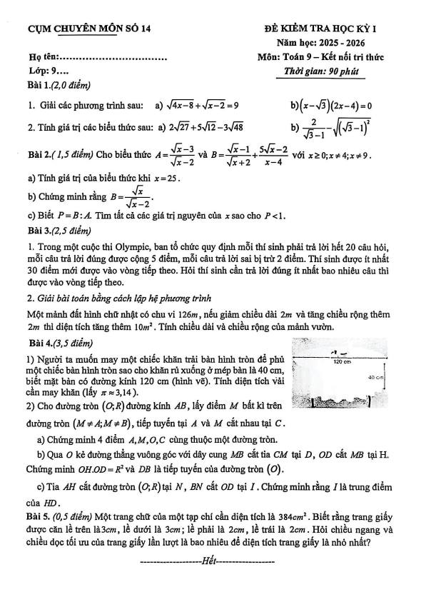 Đề học kỳ 1 Toán 9 năm 2025 – 2026 cụm chuyên môn số 14 – Hà Nội 26/12/2025