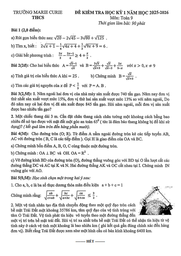 Đề Thi HK1 Toán 9 Đề học kỳ 1 Toán 9 năm 2025 – 2026 trường Marie Curie – Hà Nội