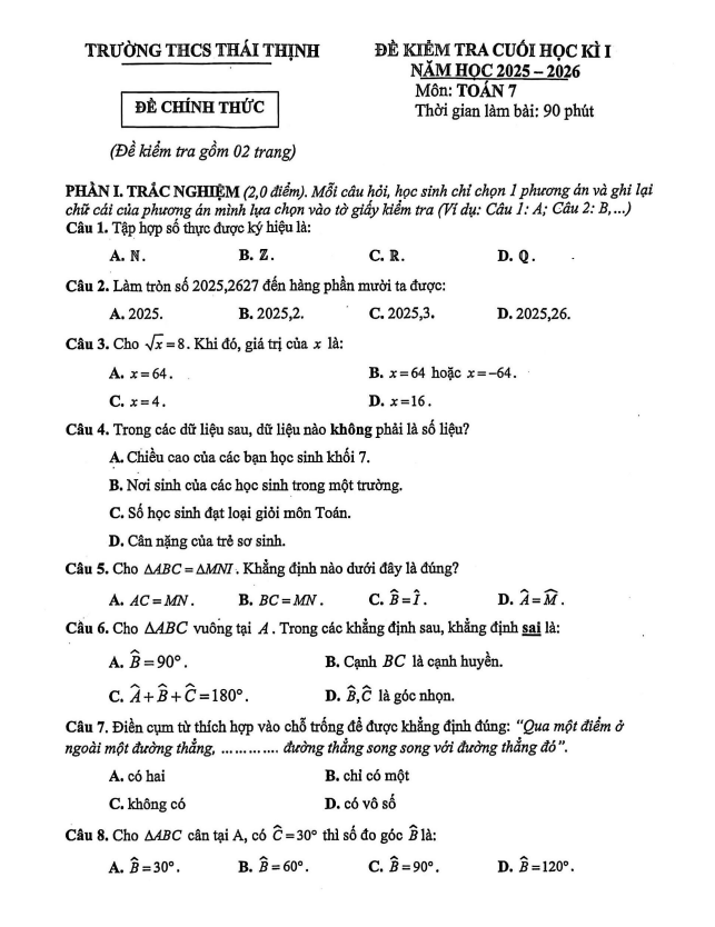 Đề cuối học kì 1 Toán 7 năm 2025 – 2026 trường THCS Thái Thịnh – Hà Nội 28/12/2025