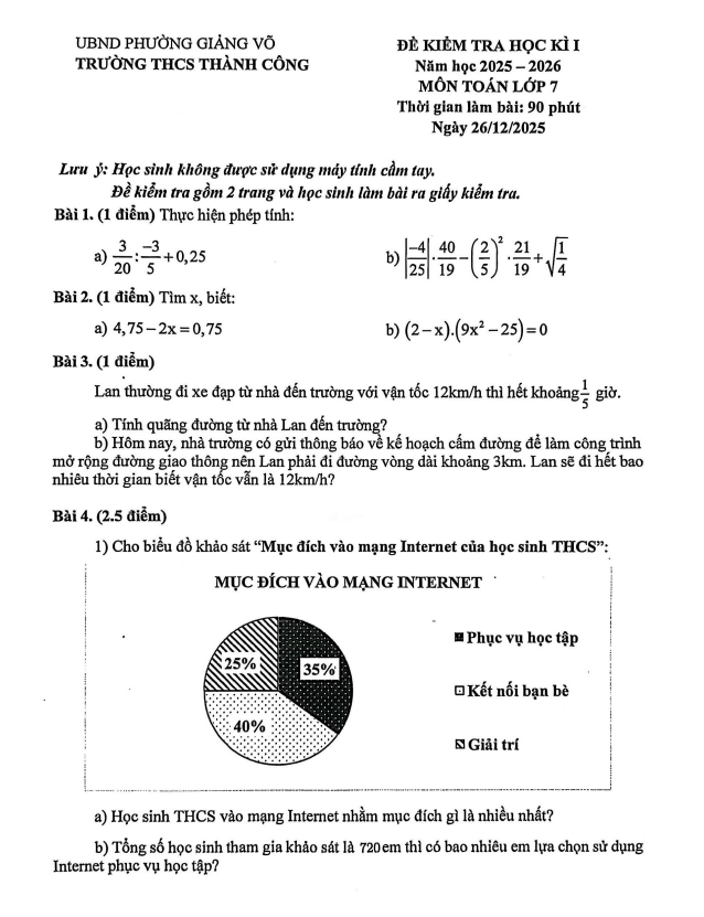 Đề học kì 1 Toán 7 năm 2025 – 2026 trường THCS Thành Công – Hà Nội 28/12/2025
