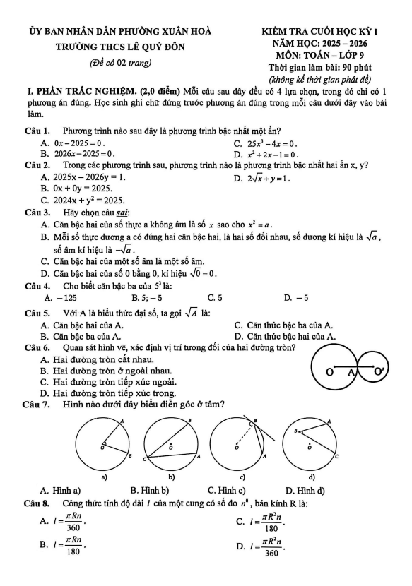 Đề Thi HK1 Toán 9 Đề cuối học kỳ 1 Toán 9 năm 2025 – 2026 trường THCS Lê Quý Đôn – TP HCM