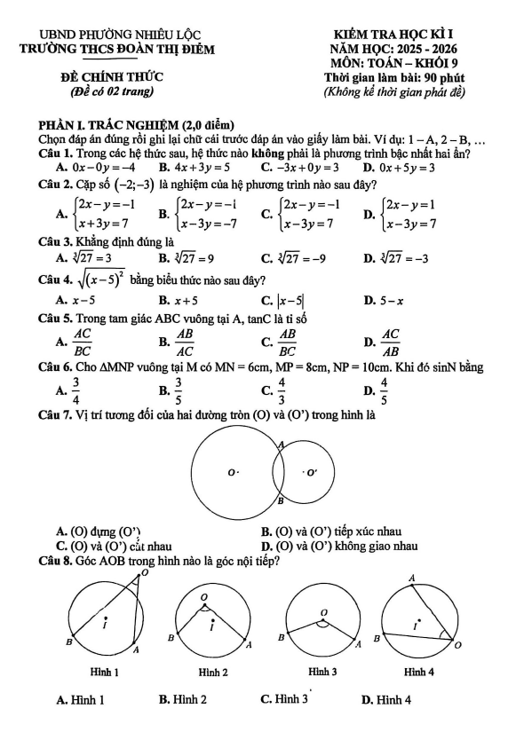 Đề Thi HK1 Toán 9 Đề học kì 1 Toán 9 năm 2025 – 2026 trường THCS Đoàn Thị Điểm – TP HCM