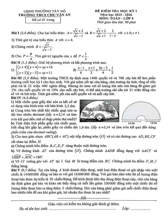 Đề Thi HK1 Toán 9 Đề học kỳ 1 Toán 9 năm 2025 – 2026 trường THCS Chu Văn An – Hà Nội