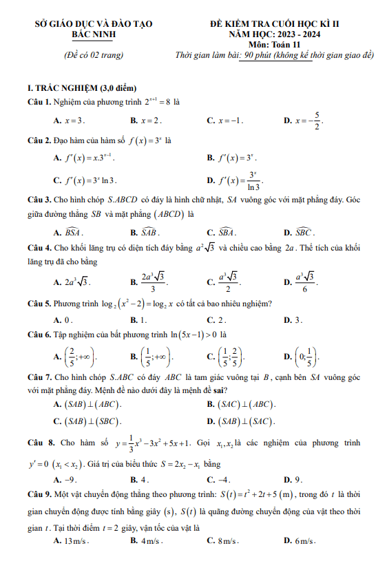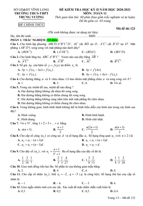 Đề Thi Học Kì 2 Toán 11 Năm Học 2020 - 2021 Có đáp án