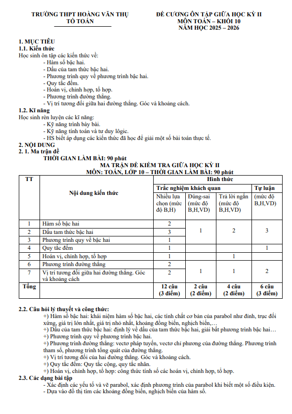 Đề cương giữa kỳ 2 Toán 10 năm 2025 – 2026 trường THPT Hoàng Văn Thụ – Hà Nội 27/02/2026