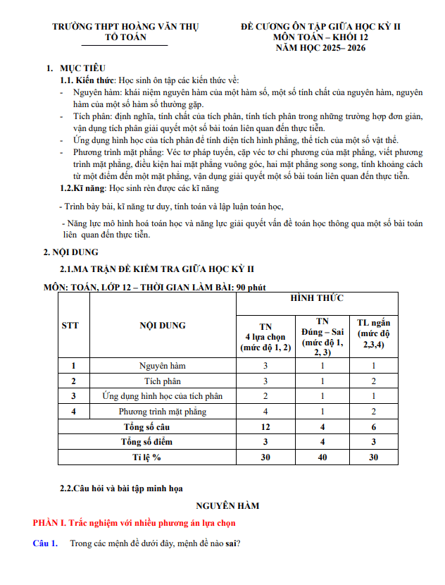 Đề cương giữa kỳ 2 Toán 12 năm 2025 – 2026 trường THPT Hoàng Văn Thụ – Hà Nội 27/02/2026