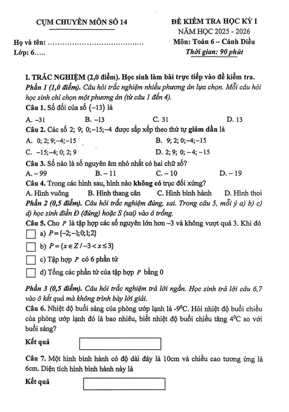 Đề học kỳ 1 Toán 6 năm 2025 – 2026 cụm chuyên môn số 14 – Hà Nội 26/12/2025