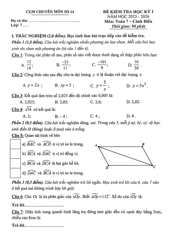Đề học kỳ 1 Toán 7 năm 2025 – 2026 cụm chuyên môn số 14 – Hà Nội 26/12/2025